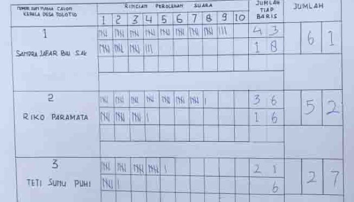 Sandra Jafar Biu, S.Ak, berhasil meraih 61 suara, unggul atas Riko Paramata (52 suara) dan Teti Sunu Puhi (27 suara). Kemenangan ini tak lepas dari strategi dan kerja keras tim pemenangan yang diketuai oleh Amed Gorapu. Sosok Amed Gorapu memang dikenal dekat dengan masyarakat Tolotio.