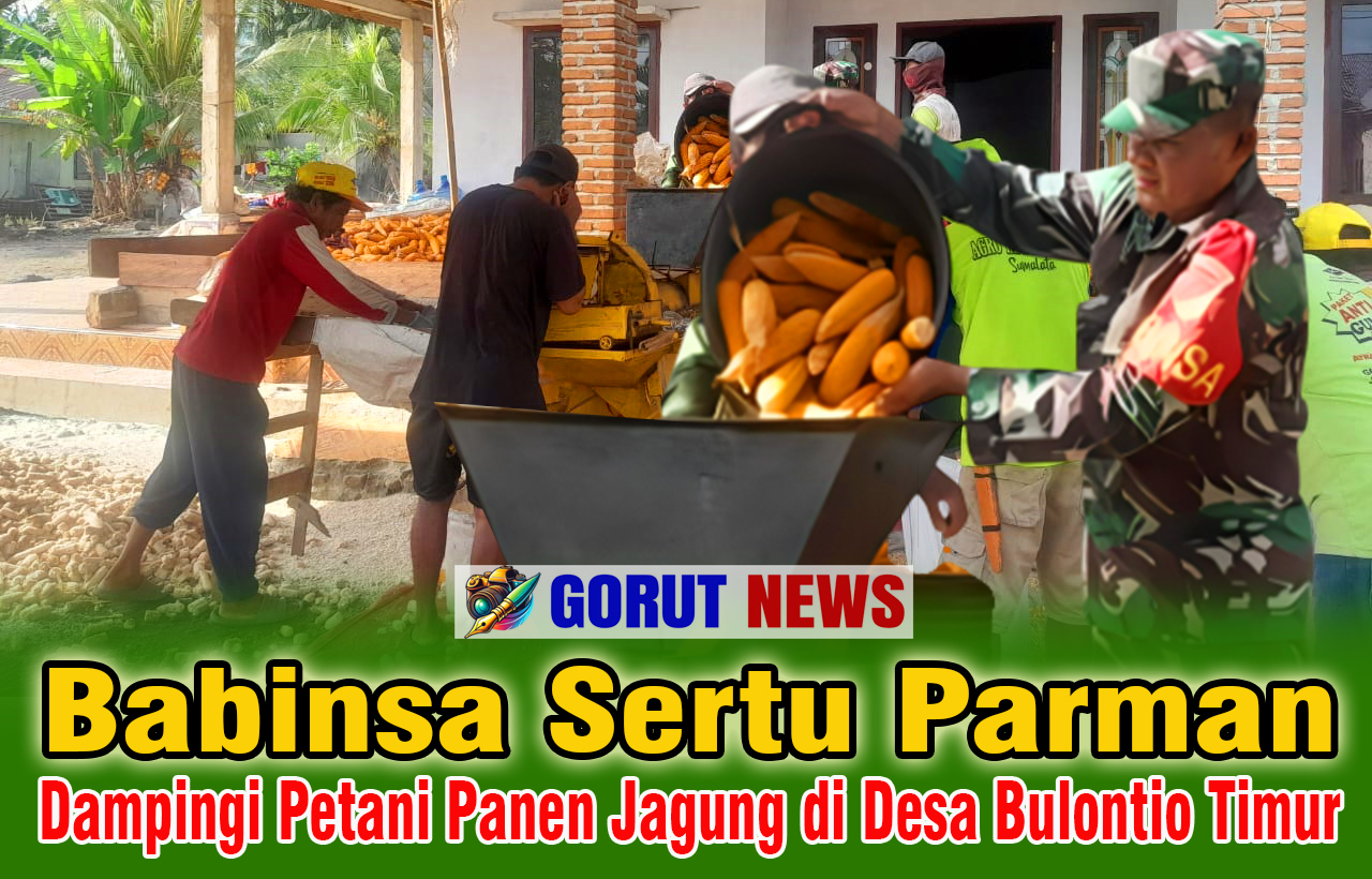 Gorut News  – Dalam rangka mendukung sektor pertanian di wilayah binaannya, Sertu Parman, Babinsa Desa Bulontio Timur, Kecamatan Sumalata, Kabupaten Gorontalo Utara (Gorut), aktif mendampingi para petani dalam kegiatan panen jagung.