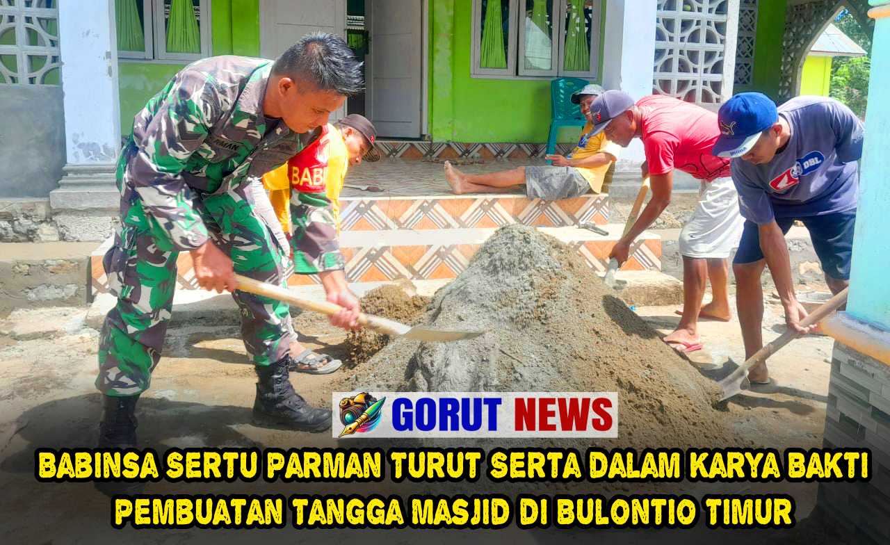 GorutNews.com – Babinsa Sertu Parman bersama masyarakat Desa Bulontio Timur, Kecamatan Sumalata, Kabupaten Gorontalo Utara, melaksanakan kegiatan karya bakti berupa pembuatan tangga masjid Pada hari Rabu, 8 Januari 2025, pukul 08.00 WITA.