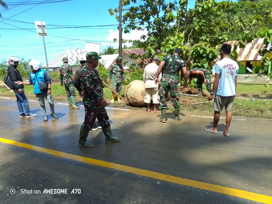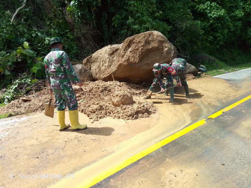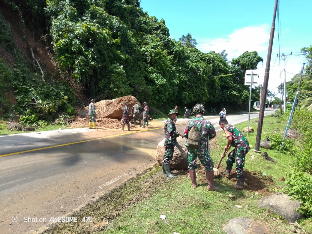 Personel Koramil 1314-01/Kwandang telah berhasil membersihkan lumpur yang menutupi jalan dan memindahkan sebagian besar material longsor. Namun, masih tersisa satu batu berukuran sangat besar yang memerlukan penanganan khusus dengan alat berat untuk memindahkannya secara aman.