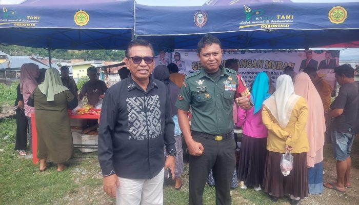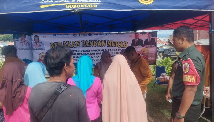 Kodim 1304/Gorontalo – Dalam rangka mendukung stabilisasi pasokan dan harga pangan di Wilayah Kota Gorontalo, Babinsa Koramil 03/Kota Barat Kopda Sutrisno hadiri Gerakan Pangan Murah bertempat di Kelurahan Dembe I, Kecamatan Kota Barat. Kamis (27/02/2025).