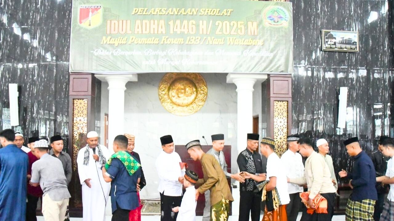 Kegiatan tersebut turut dihadiri oleh para pejabat Korem, perwira, prajurit, ibu-ibu Persit, dan masyarakat. Momentum Idul Adha di Korem 133/NW tahun ini bukan hanya menjadi ajang ibadah, tapi juga mempererat tali silaturahmi dan menumbuhkan semangat berbagi dalam bingkai keimanan.