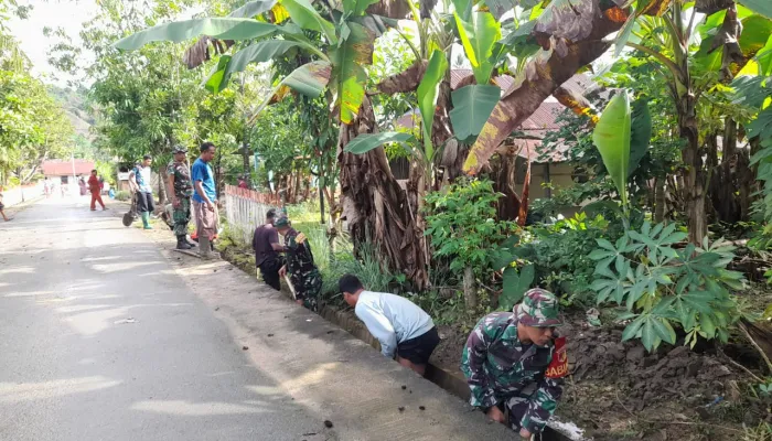 Wajah-wajah serius tampak fokus membersihkan saluran. aksi ini menunjukkan kemanunggalan antara tentara dengan elemen masyarakat setempat.