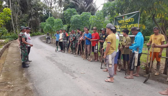 GORUTNEWS.COM, Gentuma Raya – Anggota Koramil 1314-02 Atinggola bahu-membahu bersama warga Desa Durian, Kecamatan Gentuma Raya, melaksanakan kegiatan Karya Bakti, Jumat (12/12/2025). Aksi gotong royong ini dilakukan dalam rangka menyambut peringatan Hari Juang TNI Angkatan Darat (AD) tahun 2025.