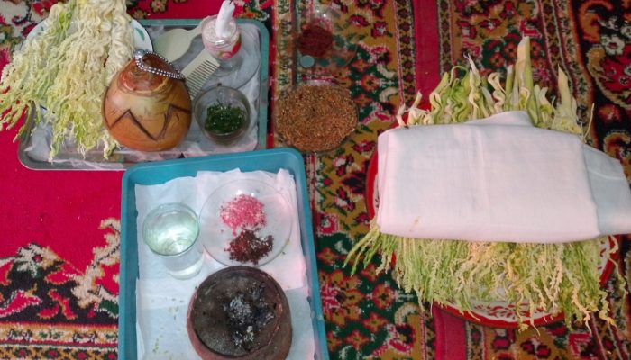 Di atas sebuah baki, terdapat kelapa muda yang bagian atasnya dibelah membentuk lima segitiga, dan sebuah paku ditancapkan sebagai pegangan. Kelapa ini berfungsi sebagai wadah untuk menyimpan potongan rambut bayi. Di atas baki yang sama juga terdapat piring berisi bunga pinang untuk bara api, kaca dan cermin untuk menyisir rambut bayi.