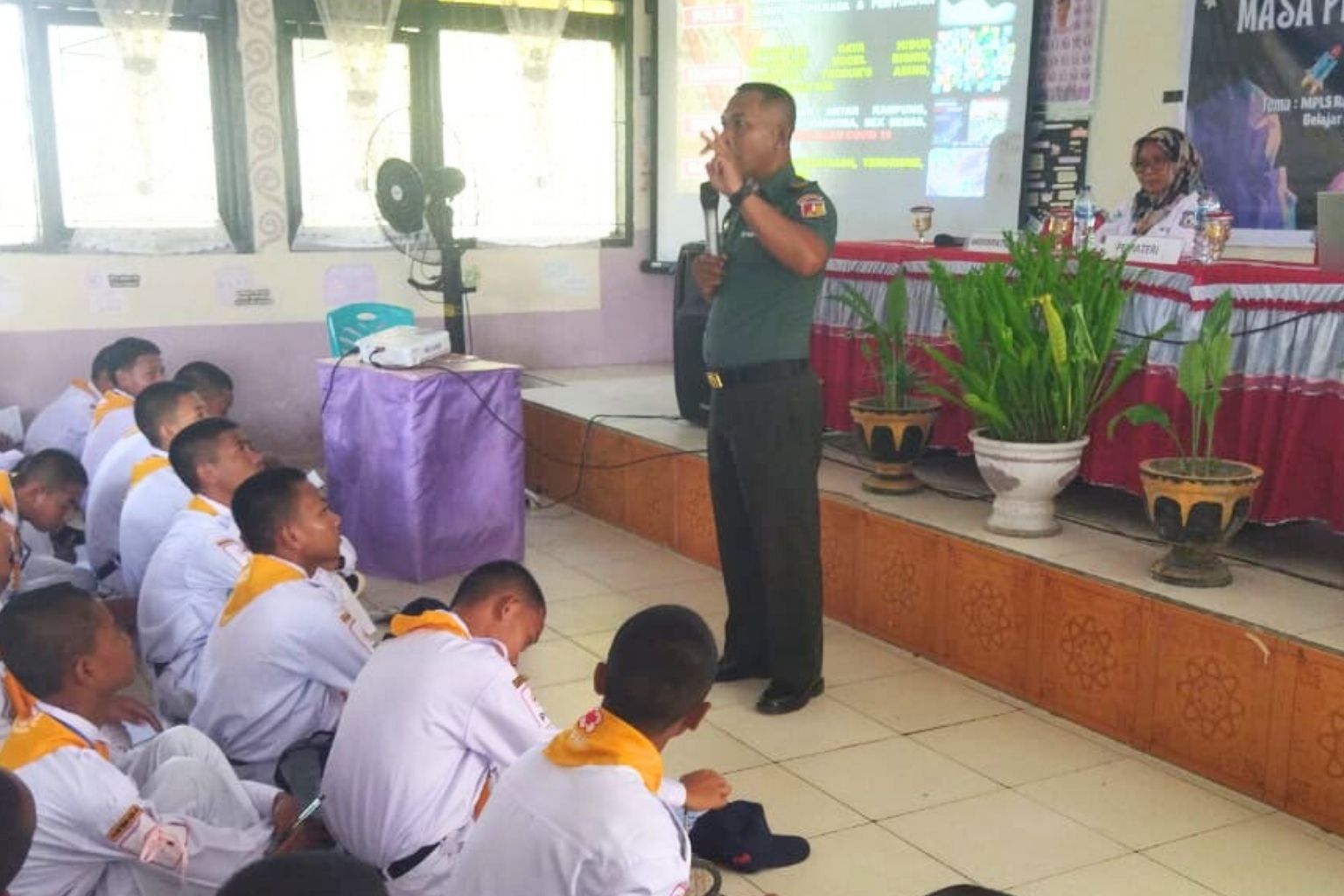 Kegiatan ini berlangsung di aula sekolah dan diikuti antusias oleh seluruh peserta didik baru. Siswa tampak menyimak dengan serius pemaparan yang diberikan secara langsung oleh personel TNI dari Kodim 1314.