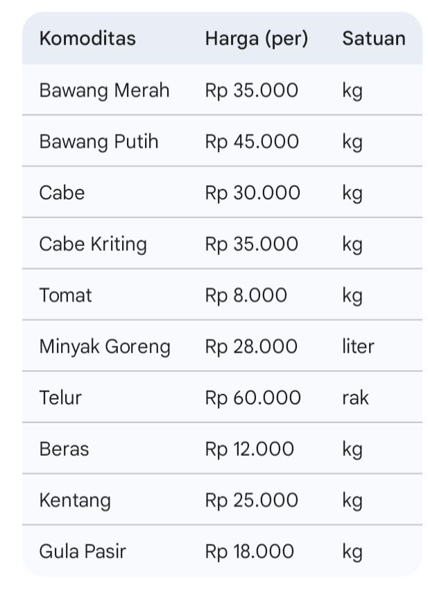Selain itu, cabe kriting dijual seharga Rp 35.000 per kilogram, tomat Rp 8.000 per kilogram, dan minyak goreng Rp 28.000 per liter. Telur dihargai Rp 60.000 per rak, beras Rp 12.000 per kilogram, kentang Rp 25.000 per kilogram, dan gula pasir Rp 18.000 per kilogram.