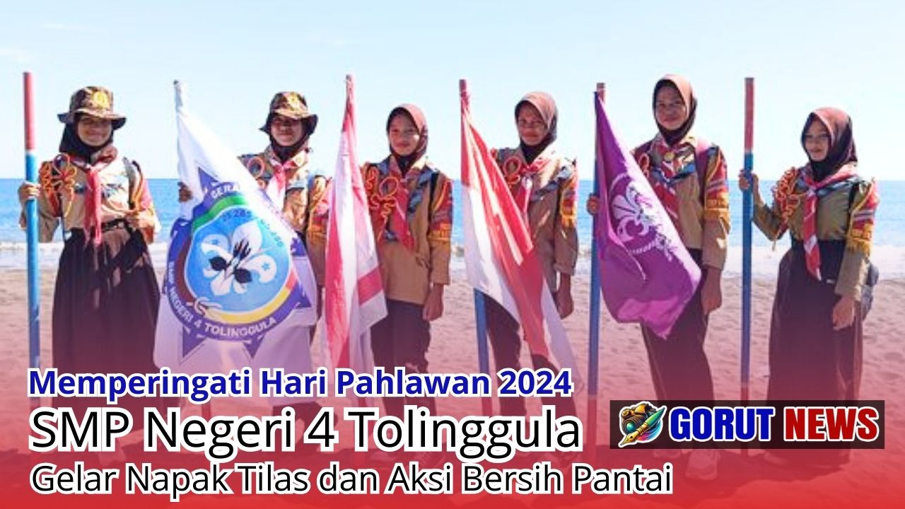 Gorut News – Menyambut Hari Pahlawan 2024, enam anggota Penggalang Pramuka SMP Negeri 4 Tolinggula menggelar kegiatan napak tilas dan aksi bersih pantai di Desa Tolinggula Pantai, Kecamatan Tolinggula, Kabupaten Gorontalo Utara. Kegiatan yang berlangsung selama dua hari ini dipimpin langsung oleh Pembina Pramuka, Heriyanto Harun, S.Ap.