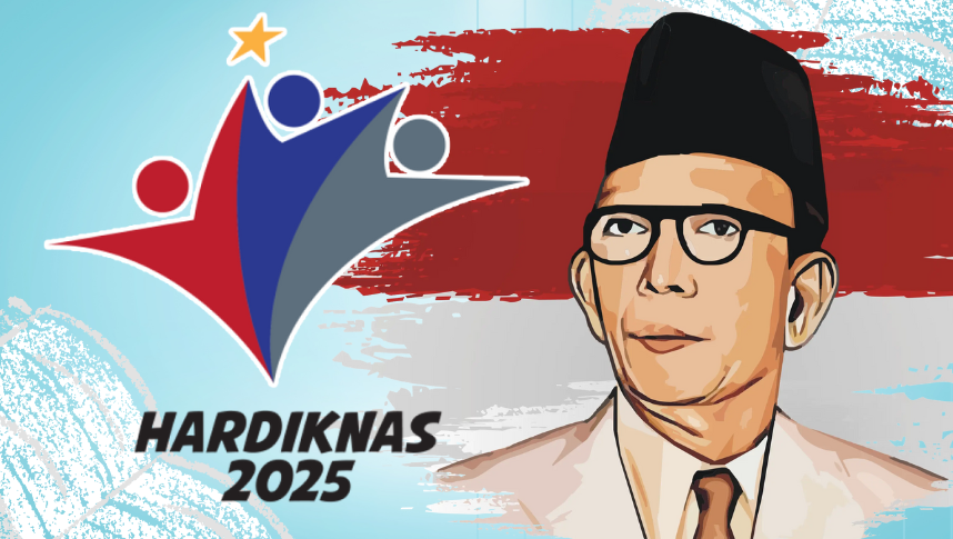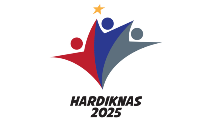Logo Hardiknas 2025 menggambarkan tiga sosok manusia yang menjulang dinamis menuju bintang emas, melambangkan kolaborasi peserta didik, pendidik, dan masyarakat dalam meraih cita-cita pendidikan yang unggul dan inklusif.