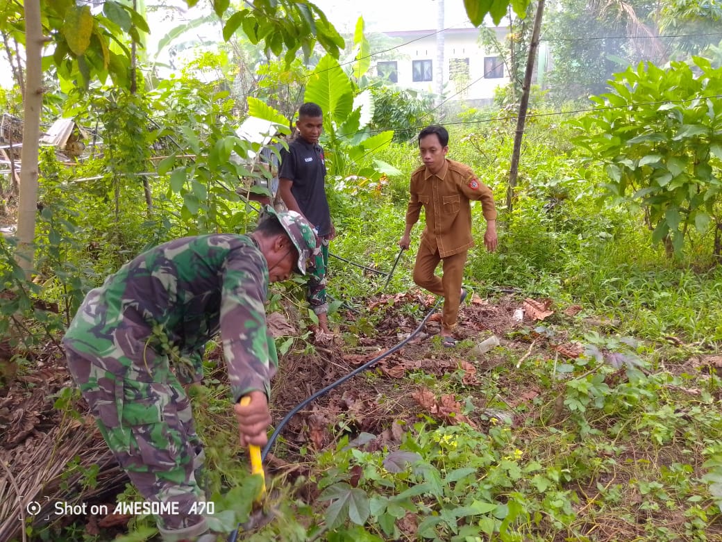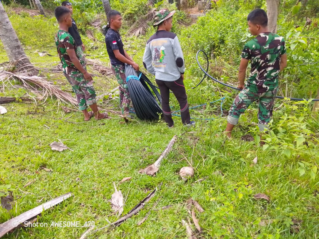 Kegiatan ini dipimpin langsung oleh Serma Ismail Hasan yang terlihat aktif memantau dan turut membantu proses pemasangan pipa dari sumber air menuju permukiman warga.