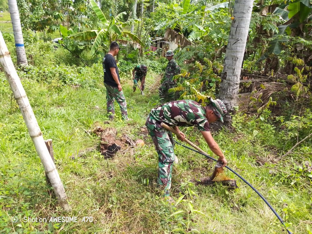 Pekerjaan dimulai sejak pagi hari dengan penggalian jalur pipa sepanjang 500 meter. Sejumlah prajurit TNI terlibat langsung di lapangan, menggunakan alat manual untuk menggali tanah dan menata pipa ke posisi yang tepat.