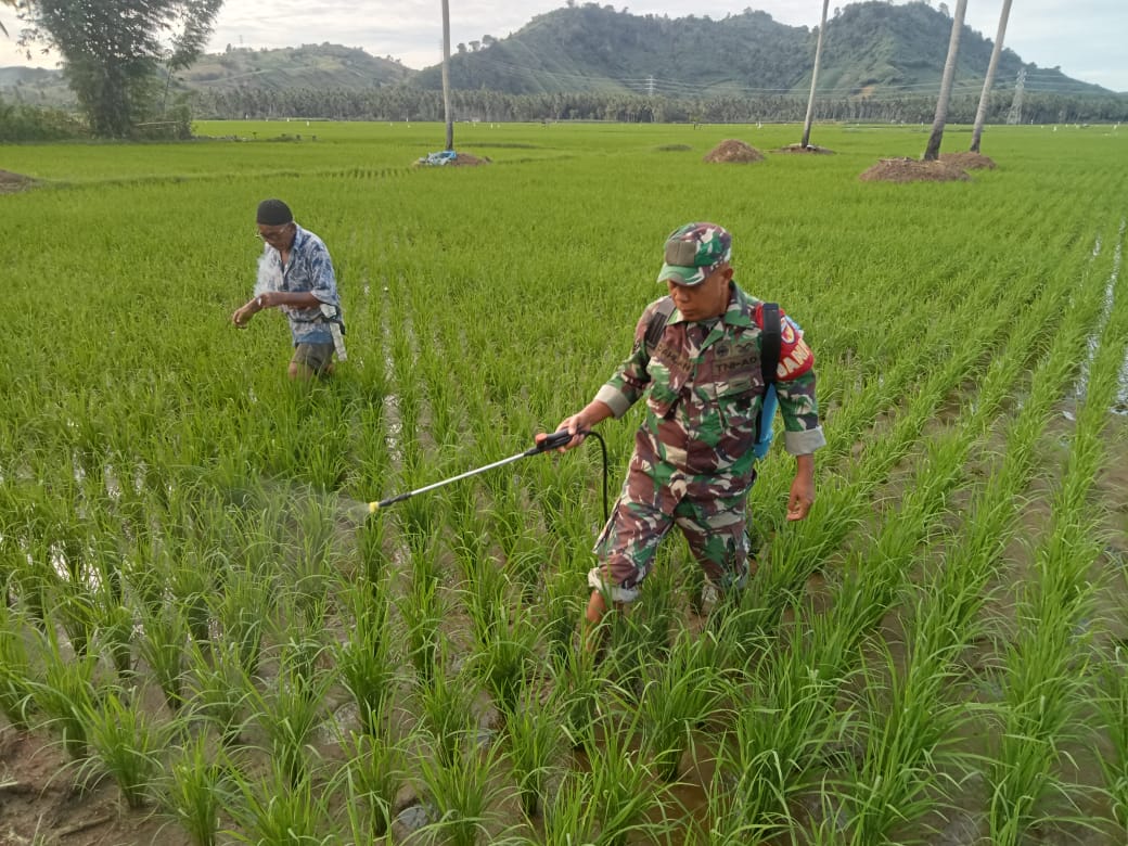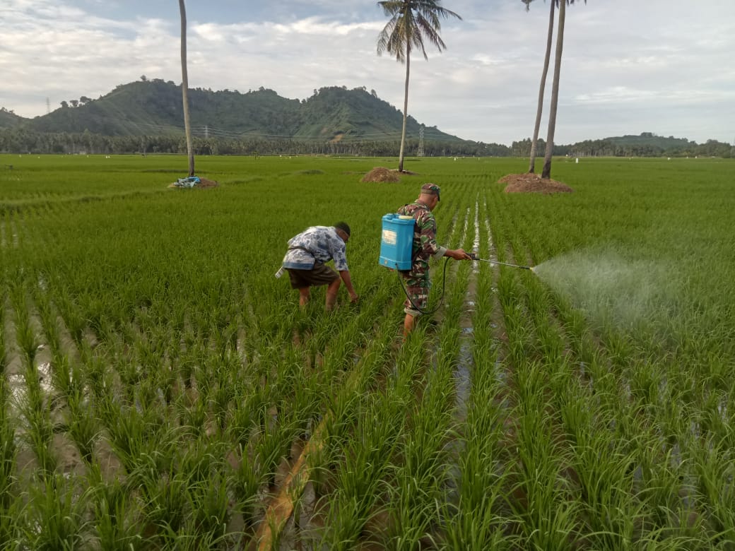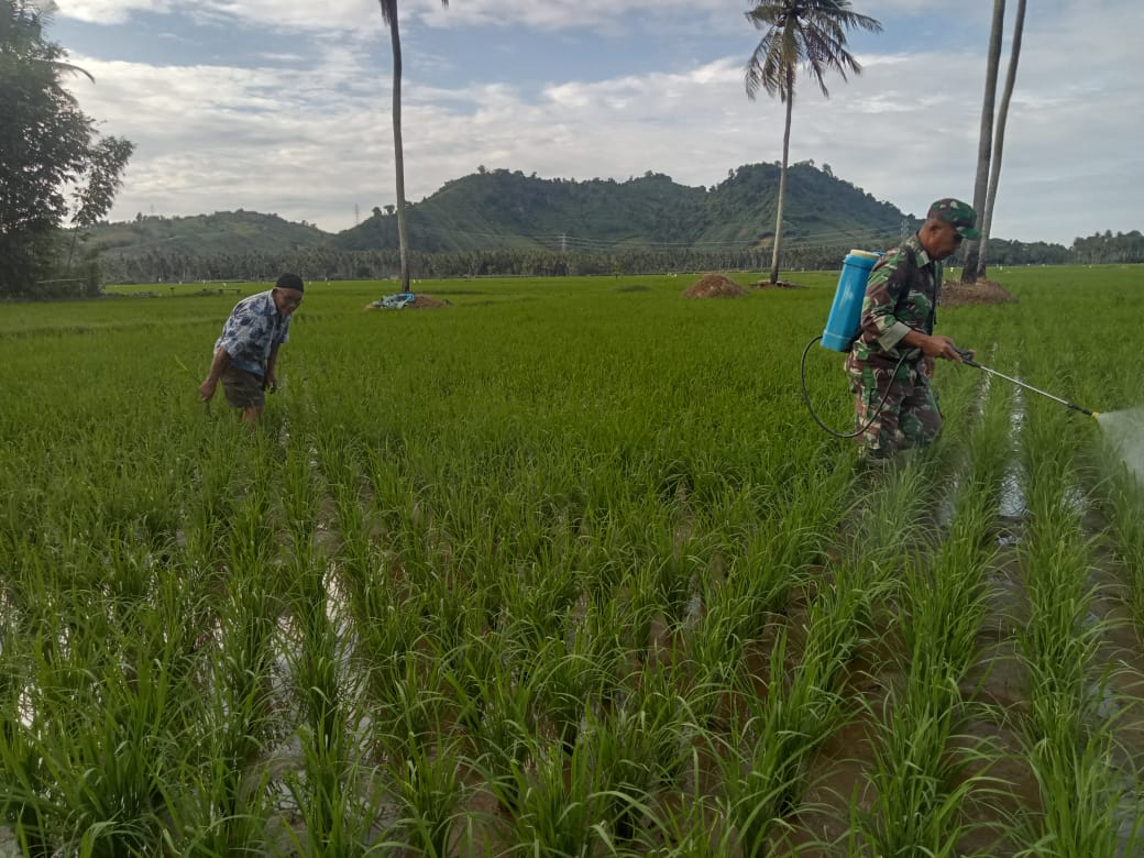 Dalam pelaksanaannya, Serka Dahlan yang mengenakan seragam loreng TNI dengan atribut Babinsa terlihat aktif membantu petani menyemprot tanaman yang terindikasi terserang hama.
