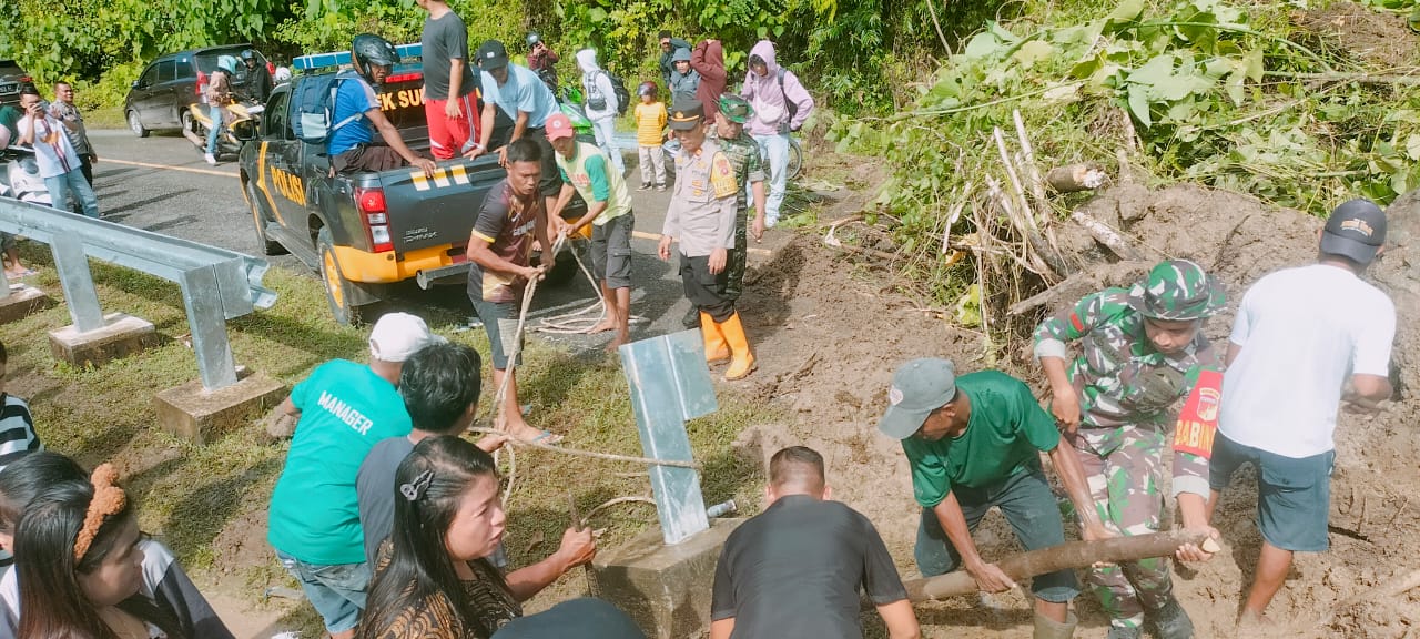 Mereka juga menjalin komunikasi dengan perusahaan-perusahaan di sekitar lokasi kejadian untuk meminta bantuan alat berat guna mempercepat proses pembersihan jalan yang tertutup material longsor.