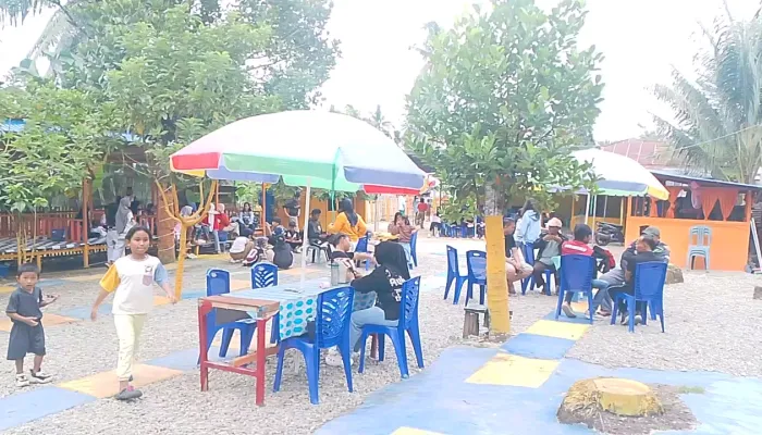 Di beberapa sudut kawasan, berdiri saung-saung kayu beratap seng biru yang digunakan pengunjung untuk beristirahat dan berkumpul bersama keluarga. Meja dan kursi plastik berwarna biru yang dilengkapi payung-payung besar warna-warni turut menambah kenyamanan, sekaligus menjadi tempat favorit untuk bersantai sambil mengawasi anak-anak bermain.